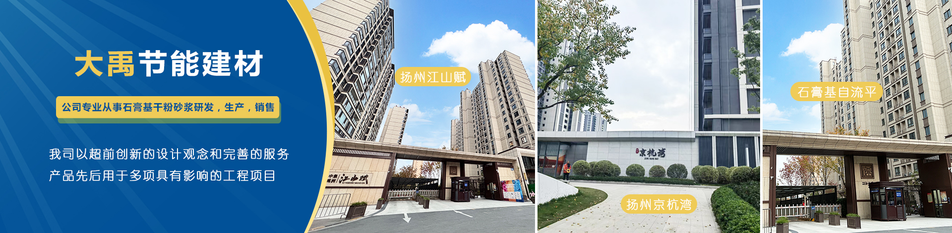 揚(yáng)州市大禹節(jié)能建材科技有限公司成立于2005年9月,位于聯(lián)合國(guó)宜居城市---江蘇省揚(yáng)州市,地處江都經(jīng)濟(jì)開(kāi)發(fā)區(qū),與揚(yáng)、鎮(zhèn)、泰三市接壤,交通十分便捷。公司是專(zhuān)業(yè)從事石膏基干粉砂漿研發(fā),生產(chǎn),銷(xiāo)售一體化的綜合性科技型企業(yè),為國(guó)家標(biāo)準(zhǔn)GB/T2862-2012《抹灰石膏》的參編單位?! 」緭碛袊?guó)內(nèi)一流的特種砂漿生產(chǎn)線(xiàn),并配有各種先進(jìn)的檢測(cè)儀器,年生產(chǎn)能力可達(dá)10萬(wàn)噸。各崗位管理及技術(shù)人員齊備,對(duì)產(chǎn)品···
